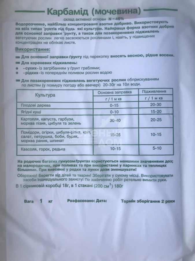 При удобрении яровых зерновых культур вносят в предпосевную культивацию. Применение удобрения обеспечивает ускорение роста вегетативной массы растений, повышения содержимого белка в зерне и урожайности культур. Основными преимуществами Карбамида являются: быстрая растворимость и легкость усвоения растениями. Удобрение целесообразно использовать под культуры с длинным вегетационным периодом - свеклу, кукурузу, зерно.
