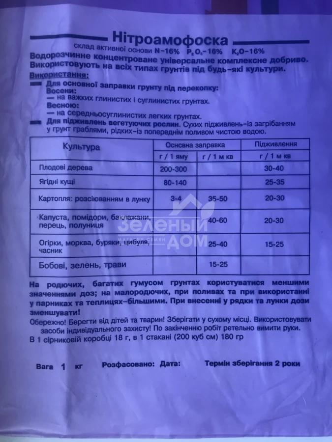 Состав: Азот 16%; Фосфор 16%; Калий 16%